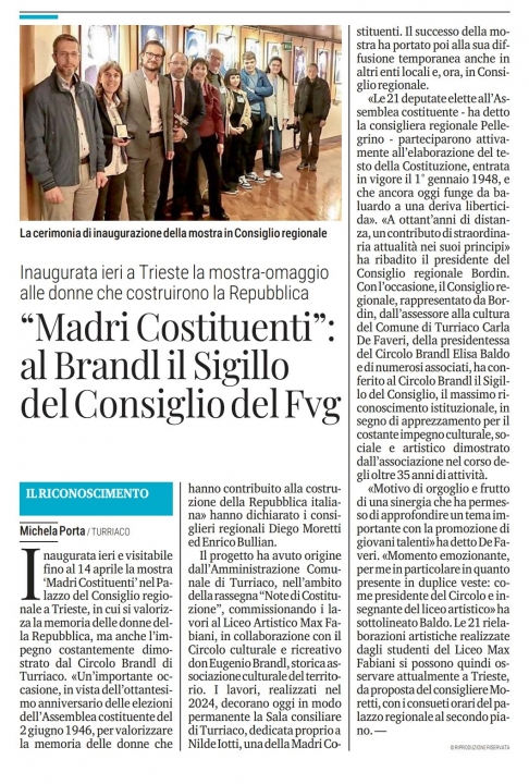 “La mostra è stata concepita con l’obiettivo di dare voce e riconoscimento a coloro che hanno posto le fondamenta della Repubblica democratica e antifascista, in occasione di un anniversario così significativo. Il progetto ha avuto origine dall’Amministrazione Comunale di Turriaco, nell’ambito della rassegna ‘Note di Costituzione’, commissionando i lavori al Liceo Artistico Max Fabiani, in collaborazione con il Circolo culturale e ricreativo don Eugenio Brandl, storica associazione culturale del territorio. I lavori, realizzati nel 2024, decorano oggi in modo permanente la Sala consiliare di Turriaco, dedicata proprio a Nilde Iotti, una della Madri Costituenti. Il successo della mostra ha portato alla sua diffusione temporanea anche in altri enti locali e ora in Consiglio regionale. Siamo particolarmente orgogliosi della realizzazione di questo progetto, non solo per il valore culturale della mostra, che con i suoi 21 ritratti trasmette la vitalità e il ruolo storico delle figure rappresentate, ma anche per il riconoscimento attribuito al Circolo Brandl. Fondato formalmente il 20 dicembre 1989 a Turriaco, con il maestro Armando Tomasin quale primo presidente, il Circolo si è distinto nel corso degli oltre 35 anni di attività per la promozione di iniziative culturali, ricreative e di comunità. Fin dall’inizio, l’associazione si è impegnata a conservare, salvaguardare e valorizzare la cultura locale, promuovendo la conoscenza del territorio bisiaco e isontino e favorendo il dialogo con altre realtà regionali, come l’Associazione Via di Natale ONLUS di Aviano, a cui ha contribuito organizzando raccolte fondi a sostegno delle attività del C.R.O. di Aviano e dell’associazione stessa.